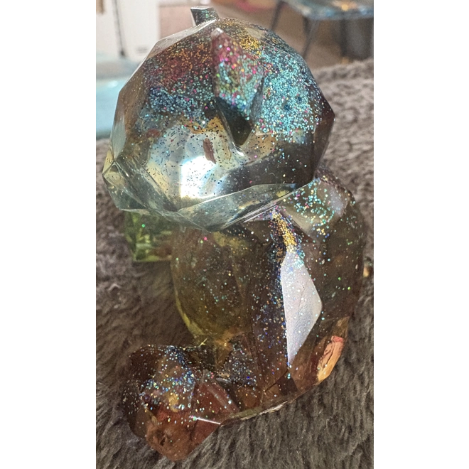 For this teddy bear I have used a transparent green base colour with blue, pink, gold and green fine glitter with dried rose petals. The rose petals on the bottom make it a little bumpy but it stands up fine.