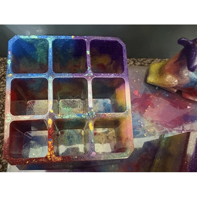 This is a beautiful multi coloured desk organiser. I have used 6 flourescent colours in this piece - Red, Yellow, Green, Blue, Coral and Purple. I added in some glitter of matching colours to really make this piece sparkle.