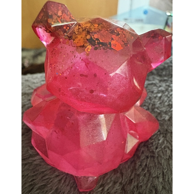 This is a lovely pink Teddy Bear with orange glitter. This teddy has orange glitter mixed in with the resin at the top of the head. The rest of the bear is pink with fine glitter through it.