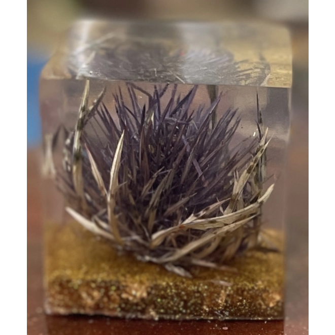 This is a beautiful dried thistle inside this lovely resin cube. With a glittery and gold leaf pieces bottom. This is a lovely piece.